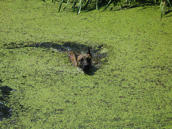 Axel findet es ganz klasse, zu schwimmen. Er läßt sich davon auch nicht durch ein wenig Grünzeug abhalten...