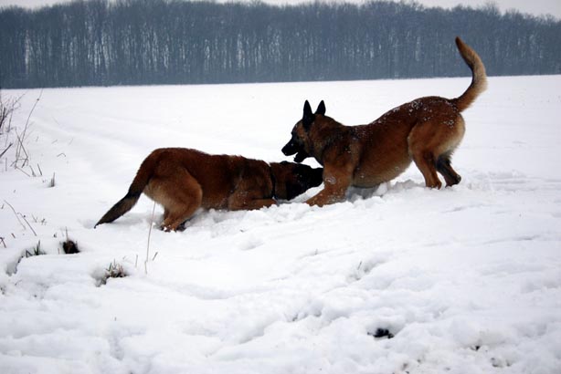 Brix (links) ist auf dem Foto fast 8 Monate alt, Axel ist genau 1 Jahr älter. Die beiden toben gerne zusammen - sie liegen "auf einer Wellenlänge". Die anderen Schneefotos sind ebenfalls am selben Tag entstanden (28. Februar 2004)