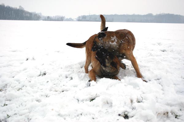 Brix (oben) ist auf dem Foto fast 8 Monate alt, Axel ist genau 1 Jahr älter. Die beiden toben gerne zusammen - sie liegen "auf einer Wellenlänge". Die anderen Schneefotos sind ebenfalls am selben Tag entstanden (28. Februar 2004)