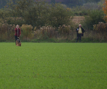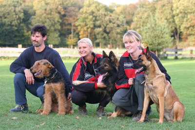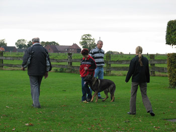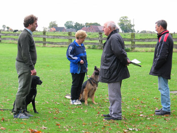 ![]() HaJo Mertmann mit Senta (BH) und Heike Brümmer-Will mit Anja. HaJo hat die BH-Prüfung bestanden, Heike und Anja haben "nur" als Blindenhund fungiert. |