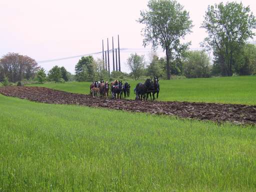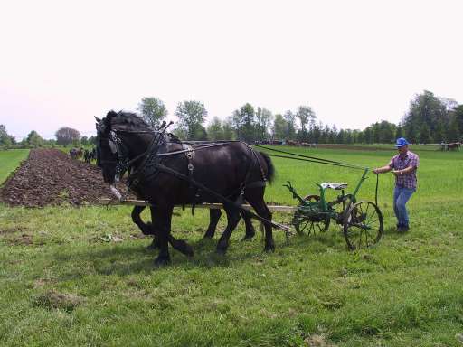 Pferde gesehen, die mit alten Pfluggeräten einen Acker bearbeitet haben.