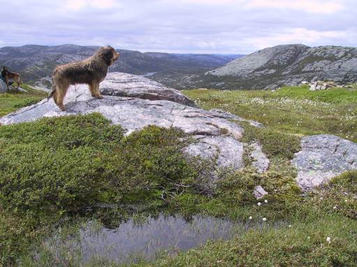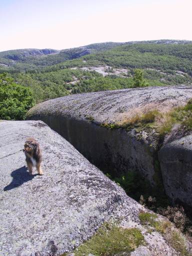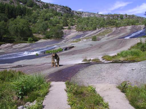 Heute machen wir einen längeren Ausflug. Skrelia steht auf der Karte, Skreli am Parkplatz. Wir sind die einzigen, und das bei tollem Wetter. Einen ganzen Tag Wandern, am Wasserfall entlang, mit Blick auf den Fjord, Trinkpausen am See, Flußüberquerungen - Super! Auch die Zweibeiner sind ganz begeistert von der tollen Landschaft und den schönen Ausblicken. Ein wenig Angst haben sie zwar, wenn wir zu nah an den teils riesigen Felsspalten vorbeigehen, aber wir haben ja schließlich zwei Beine mehr, da ist das für Hunde kein Problem. Wollt ihr auch hiervon ein paar Fotos sehen?