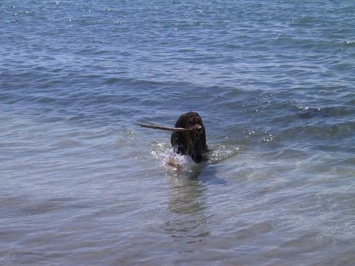 Sonne, wir fahren zum Strand. Herrlich ist es da! Schwimmen, Stöckchen holen,