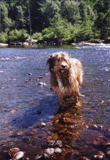 Trotz der glitschigen Steine fand Brösel es toll im Fluß. Wasser findet er aber sowieso in jeglicher Form klasse.